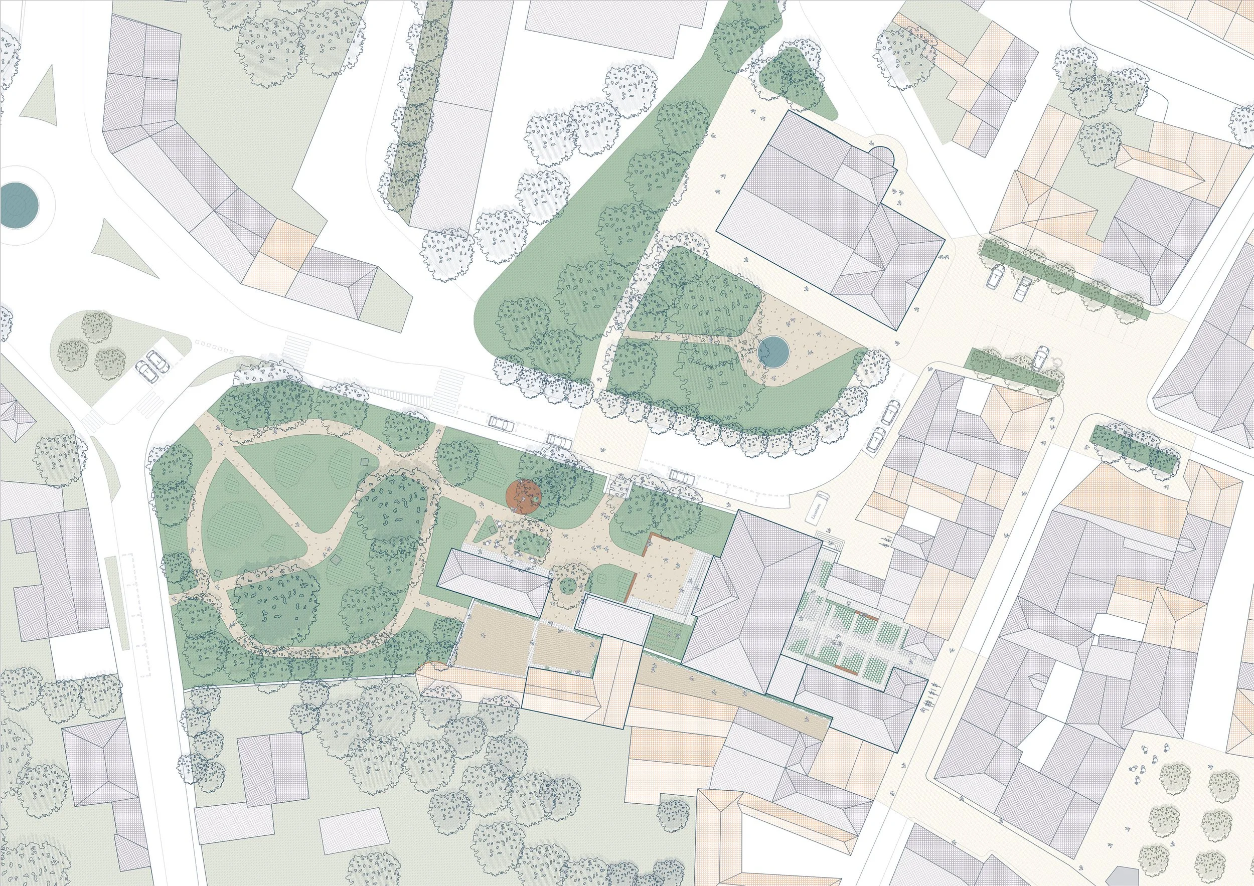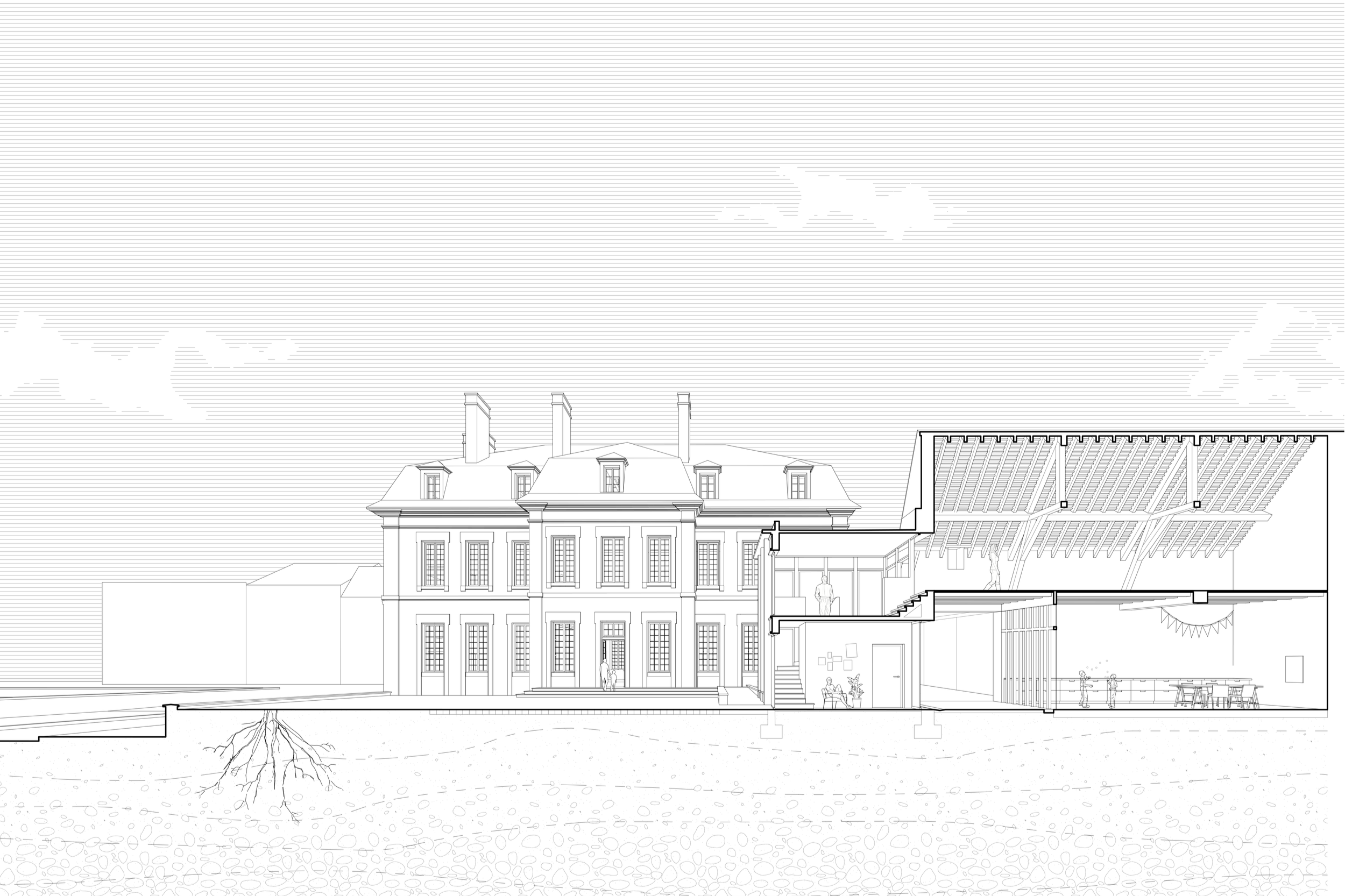 Côté jardin, les dépendances et les granges de la venelle possèdent un caractère champêtre et vernaculaire en cohérence avec le tissu urbain. Pour accéder à l’étage des granges, l’ancien préau, vétuste, est remplacé par un édicule à la structure bois, réinterprétant les colombages berrichons. Enfin, le bâtiment Chorale est ouvert par une large baie qui permet au salon de thé de s’y loger et de s’ouvrir largement sur la terrasse.