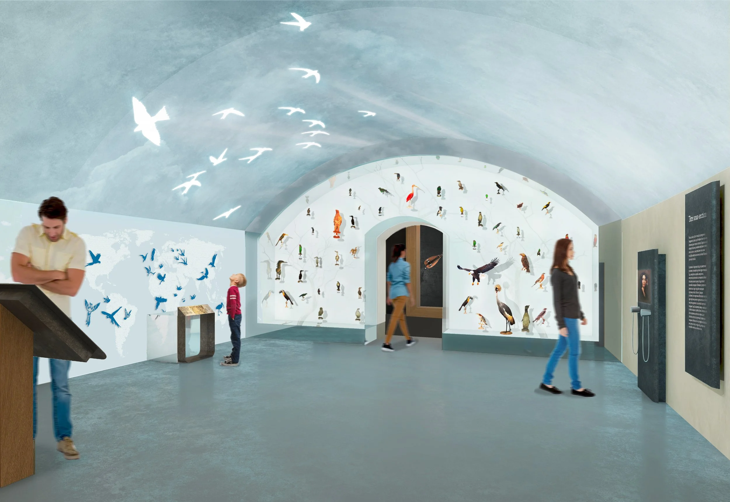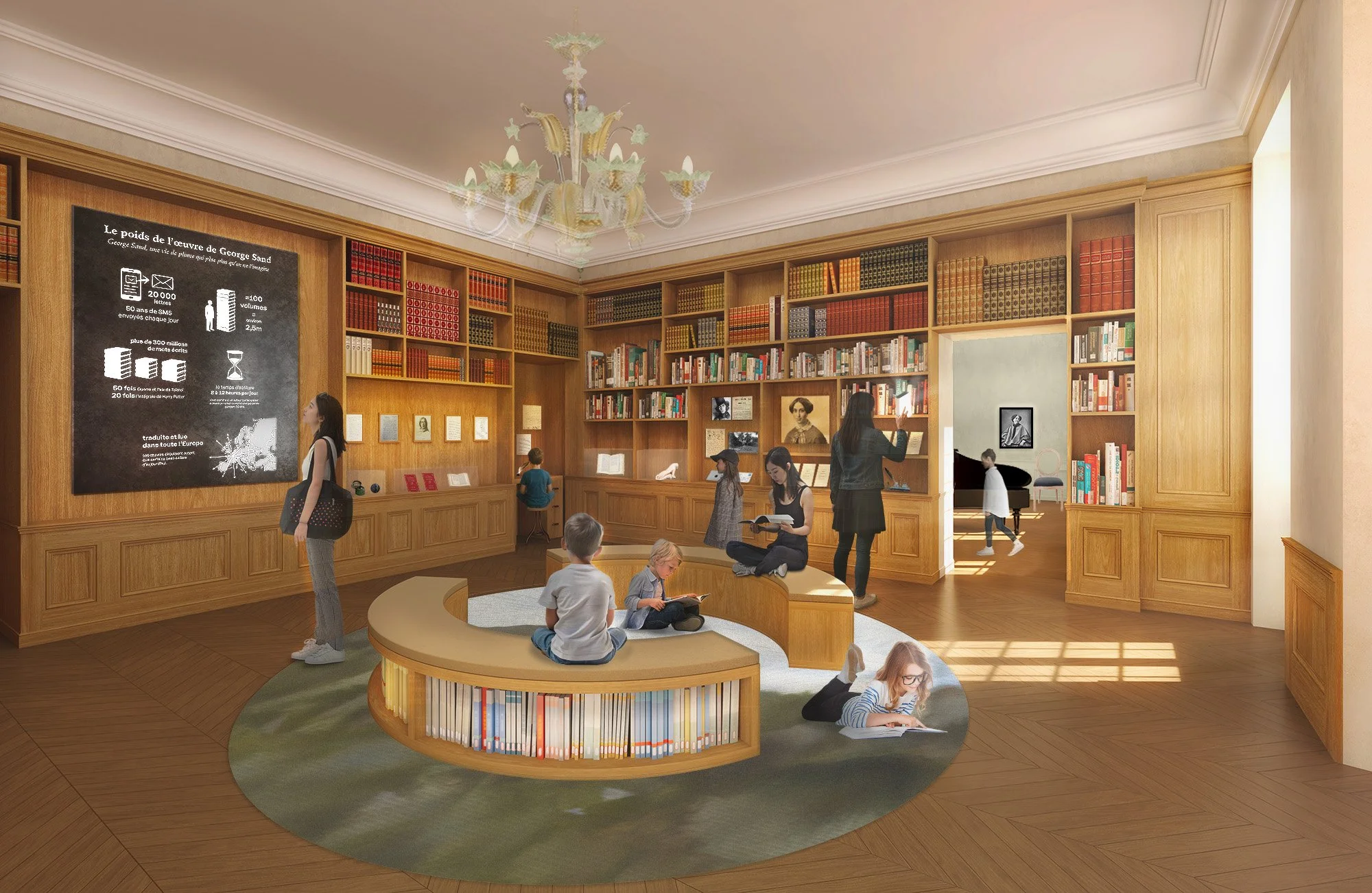 Le parcours muséographique est conçu comme une déambulation fluide depuis le haut du bâtiment et autour du nouvel escalier. Depuis une bibliothèque feutrée où des “livres murmurants” diffusent les mots de l’autrice, le parcours se poursuit vers un cabinet de littérature et de musique qui mettent en lumière le cercle intellectuel et artistique de George Sand. Au sous-sol, le “Voyage en Berry” propose alors une transition marquée : les salles voûtées évoquent la terre, le paysage, les courbes de la vallée. Les oeuvres se fondent dans un décor organique et immersif, tandis qu’une animation projetée sur la voûte invite à une contemplation sensible de la postérité de l’écrivaine.